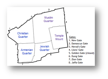 Jerusalem is a divided city within a divided country (or two countries, depending on who you ask) and there’s even a divided city within it: the Old City, which has four quarters; the Jewish Quarter, the Christian Quarter, the Moslem Quarter, and the Armenian Quarter.
