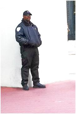 When the Bank of America is open he stands by the door. I wouldn’t even think of robbing this branch. I’m even afraid to speak to him, with his gun and his sunglasses.