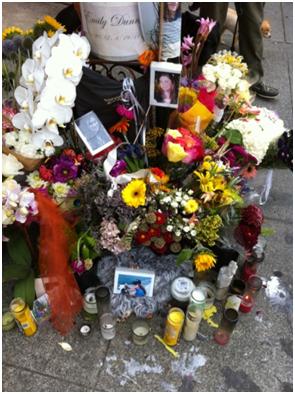 On my block, a 23-year old girl named Emily Dunn was hit by a bus and killed and this memorial grew and then, itself, died.