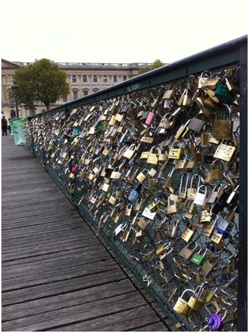 But what of love? Death gets its statues but love we mark on our own. Here, on a bridge over the Seine, sweethearts lock padlocks to mark their affection.