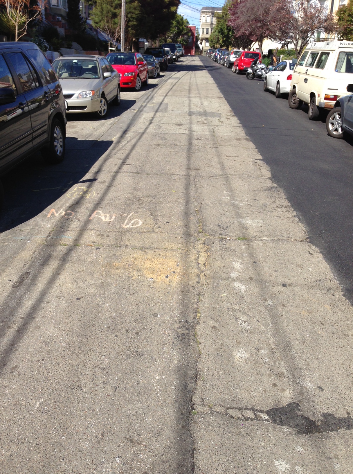 An allée of trees frames a zone for dedicated pedestrians. The pavement is a little different there.